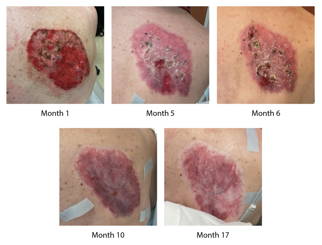 The photos below show a large Basal Cell Carcinoma on a patient’s shoulder and the treatment progression over 17 months.